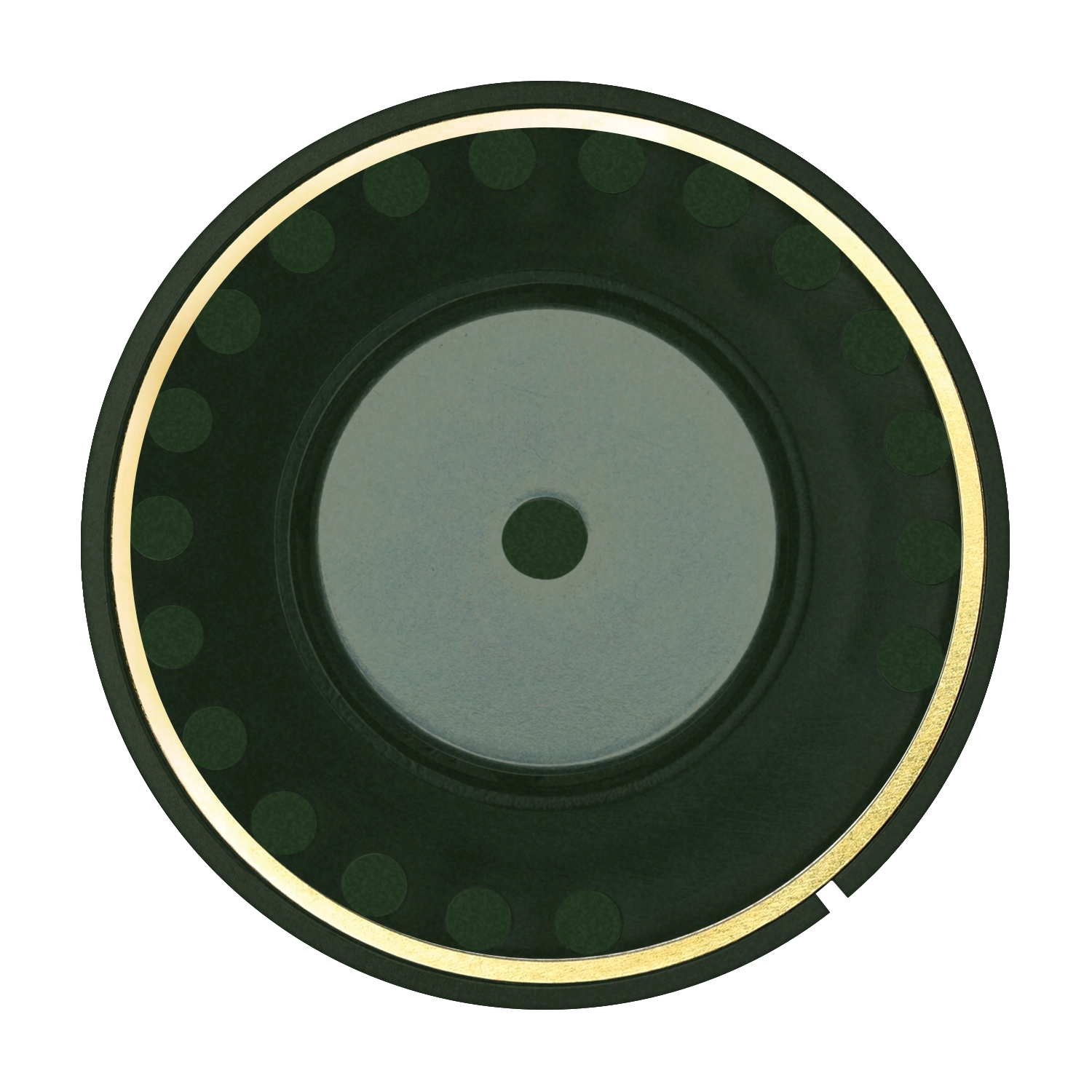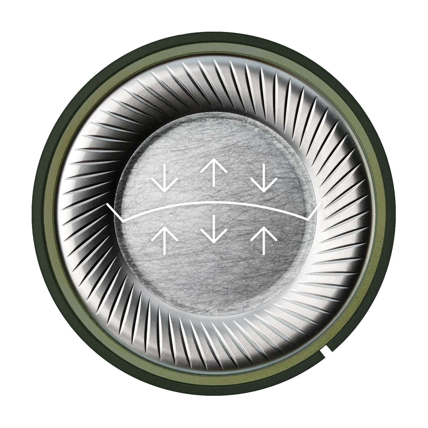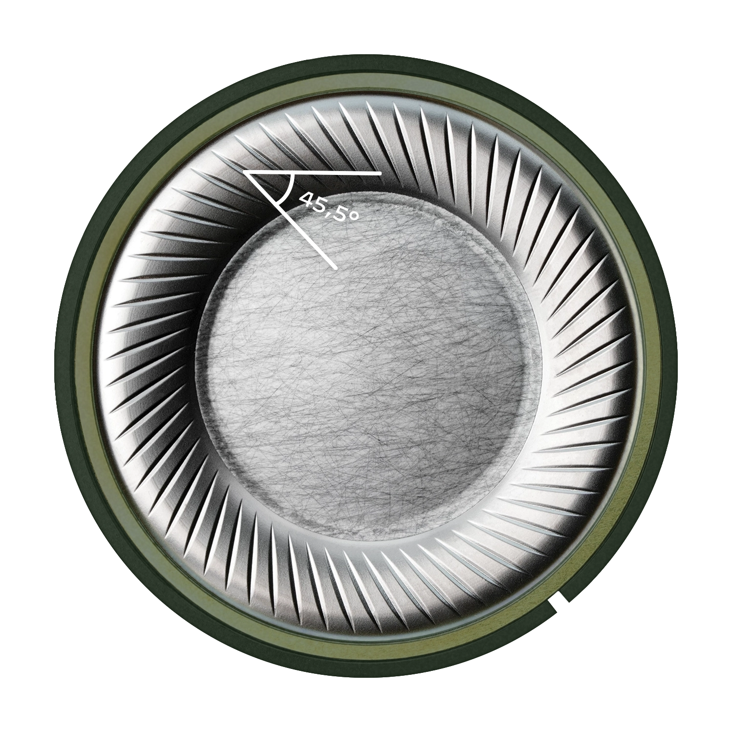 The torus surrounding the dome is composed of beryllium-coated semicrystalline polymer. By applying the beryllium coating through Physical Vapor Deposition (PVD), we increased the stiffness and durability of the driver, while still keeping it light enough to achieve a fast transient response. These qualities are also enhanced through the grooves on the torus, which are precisely positioned at a 45.5° angle.