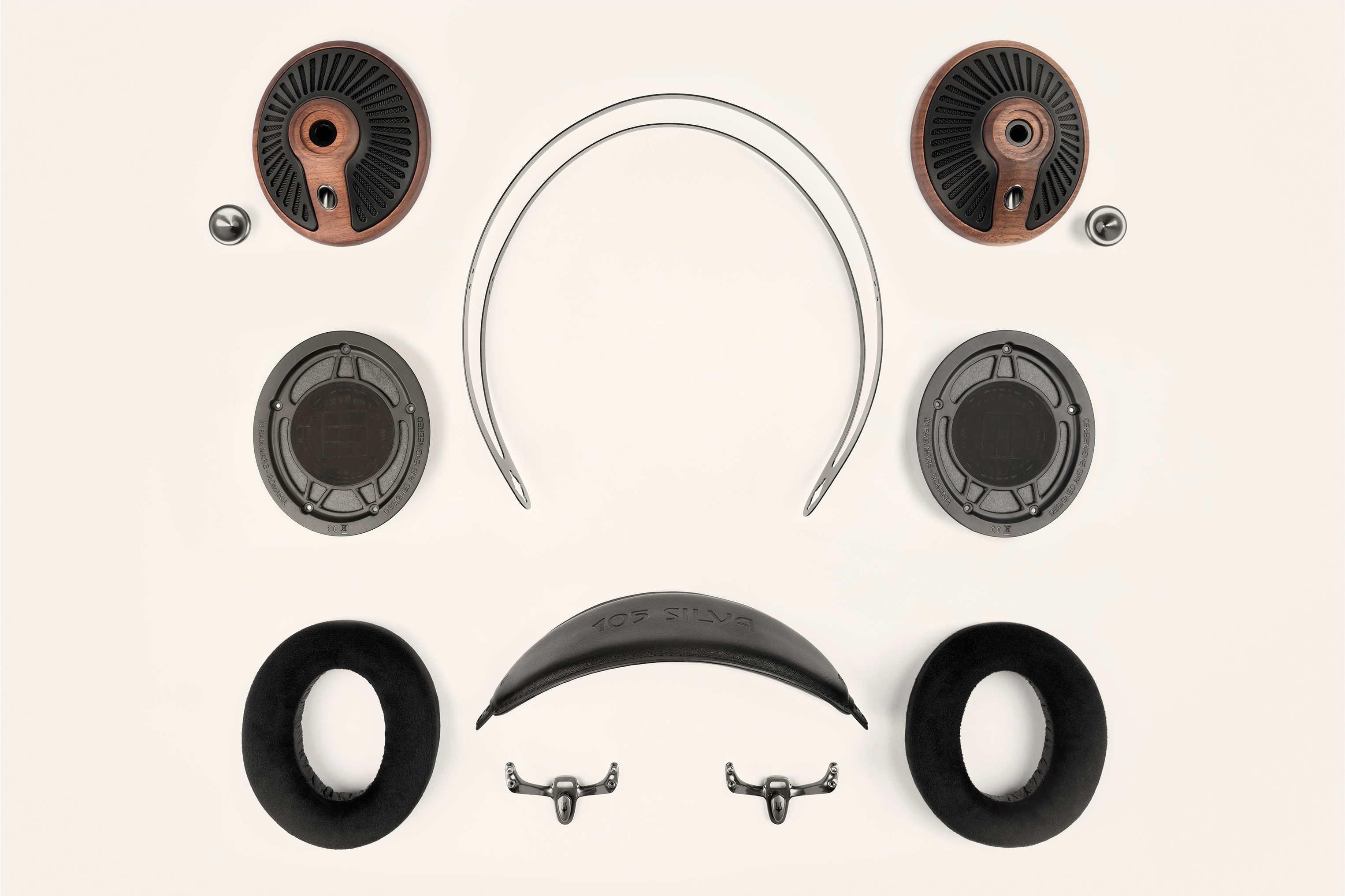 Rooted in the Mid-Century Modern movement, 105 SILVA’s design follows the core principles of clean shapes, functionality, and durability, while seamlessly integrating natural and modern materials in its construction. Fusing vintage charm with contemporary aesthetics, the radial grille sublimely intertwines with the walnut wood to form the ear cups, creating a feel that never truly ages. The spring steel headband and the PVD-coated cast zinc alloy hardware link everything into an extremely sturdy, yet highly flexible structure.